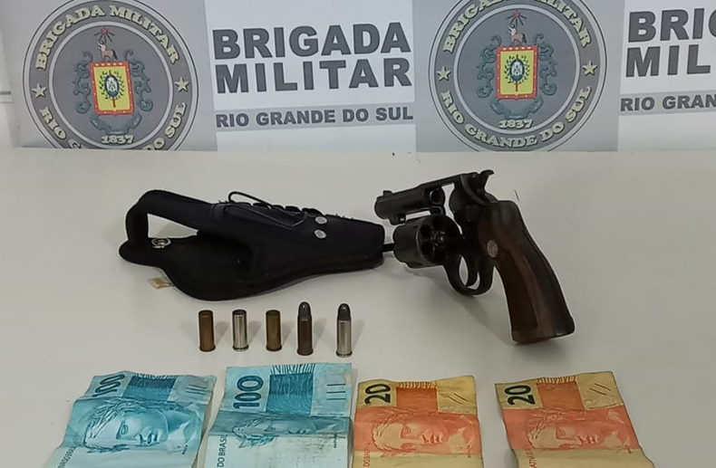 O revólver calibre 32 estava na cintura do homem. Segundo informações da Brigada Militar, a arma estava com numeração suprimida, duas munições intactas e três deflagradas. Uma quantia em dinheiro também foi apreendida.
