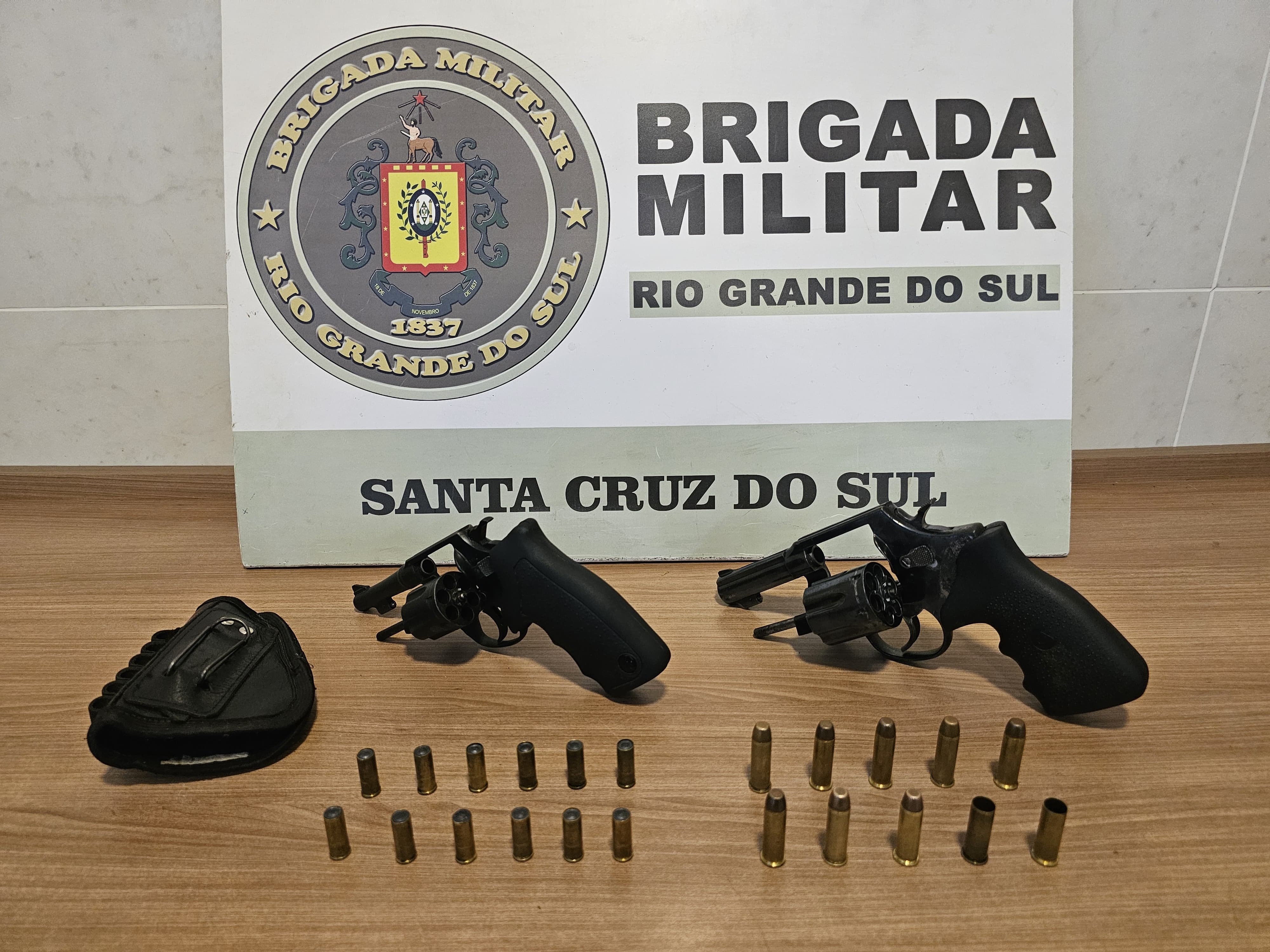 A Brigada Militar prendeu, no início da tarde desta segunda-feira, 3, um homem de 20 anos por porte ilegal de arma de fogo. A detenção aconteceu na residência do suspeito, localizada no Bairro Menino Deus, em Santa Cruz do Sul. Durante a ação, foram encontrados dois revólveres municiados: um de calibre .38, com oito munições intactas e duas cápsulas deflagradas, e outro de calibre .32, com 12 munições intactas.