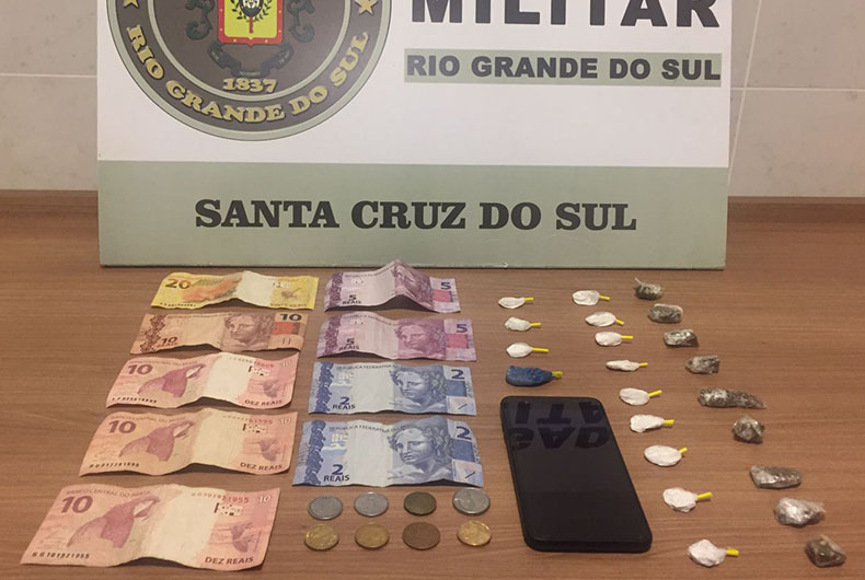 Com ele, foram encontradas 13 porções de cocaína e nove porções de maconha. Também houve apreensão de R$ 75,00 em dinheiro e um celular. O suspeito foi levado à Delegacia de Polícia, para registro, e depois encaminhado ao Presídio Regional de Santa Cruz do Sul.