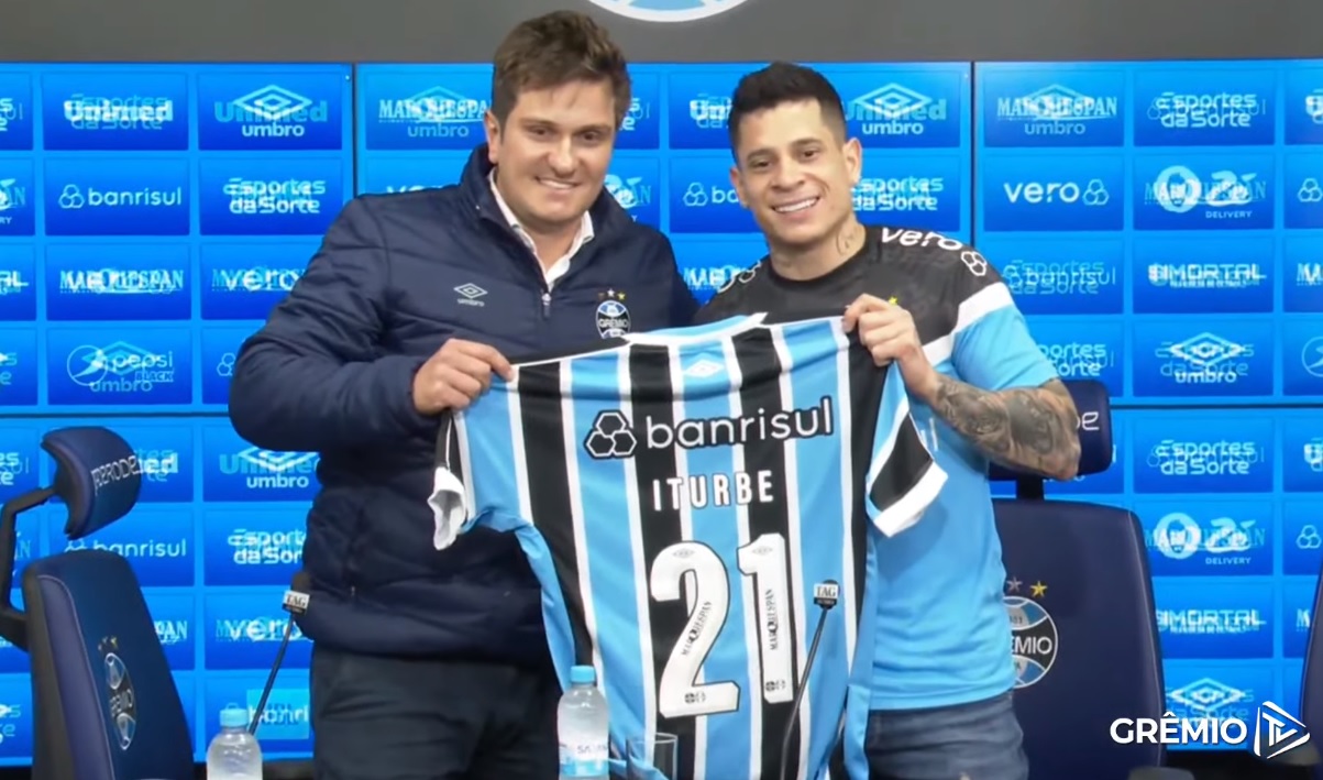 O Grêmio apresentou o atacante Juan Manuel Iturbe nesta segunda-feira, 10. O argentino naturalizado paraguaio de 30 anos recebeu a camiseta 21 das mãos do vice-presidente de futebol, Antônio Brum. Na primeira declaração, o atleta disse uma frase que mexeu com os torcedores nas redes sociais: “Escolhi o Grêmio porque é o maior do Sul.”