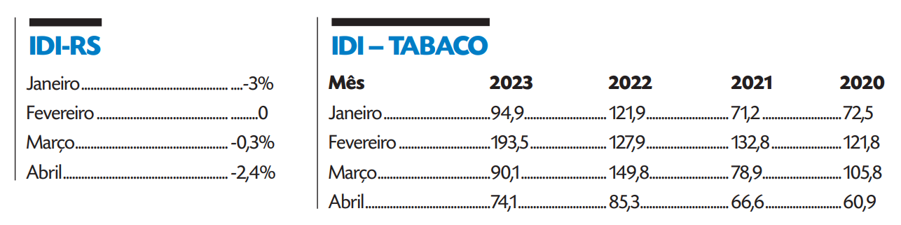 Na comparação anual de 2023 com iguais períodos de 2022, também houve recuos do IDI-RS de 4,7% em abril (o quarto seguido na comparação com o mesmo mês do ano anterior), e de 2,7% no acumulado dos primeiros quatro meses. A queda da atividade industrial até abril deste ano é disseminada, atingindo quatro dos seis componentes do IDI-RS e 11 dos 16 setores analisados.