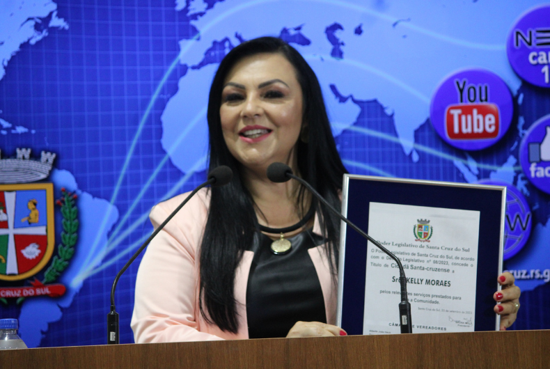 A Câmara de Vereadores de Santa Cruz do Sul realizou nessa segunda-feira, 25, uma sessão solene para a entrega do título de Cidadã Santa-cruzense para Neiva Teresinha Marques, a Kelly Moraes. A proposição foi da vereadora Nicole Weber (PTB), subscrita por Serginho Moraes. A sessão solene foi conduzida pelo vereador Licério Agnes (PSD), sendo que a mesa contou ainda com a presença do deputado federal Marcelo Moraes (PL) e do ex-prefeito e ex-deputado Federal Sérgio Ivan Moraes (PL). Na plateia, além de familiares, estavam amigos e simpatizantes.