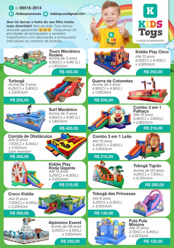 A Kids Toys conta com aproximadamente 40 opções de brinquedos, que podem ser locados de forma individual ou em combos. A empresa ainda oferece opções de decoração para embelezar a diversão. Mais informações podem ser obtidas pelas redes sociais: kidstoyslocacoes no Facebook; pelo e-mail [email protected] ou pelo telefone/whatsapp (51) 99516 2614.
