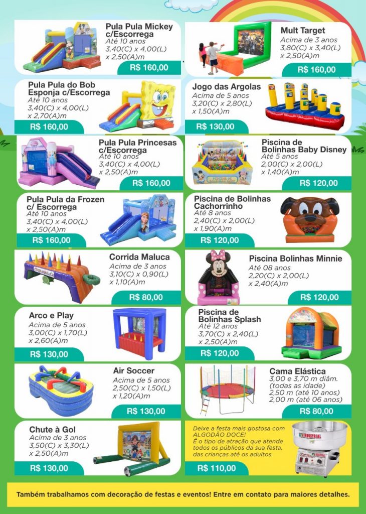 Produtos de qualidade – Prestes a completar dois anos no mercado santa-cruzense no mês de abril, a Kids Toys é uma empresa especializada em locação de brinquedos infláveis para festas e eventos. Em seu diferencial está a qualidade dos produtos, que são sempre cuidadosamente higienizados. Na Kids Toys, o comum vira especial: brinquedos tradicionais, como pula-pula e piscinas de bolinhas, ganham nova versão com temática de desenhos famosos, como Minions, Mickey, Minnie e Princesas. “Nossa equipe realiza a montagem e a desmontagem dos equipamentos e, se o cliente desejar, um monitor permanece junto no evento para orientar o uso do brinquedo”, afirma.