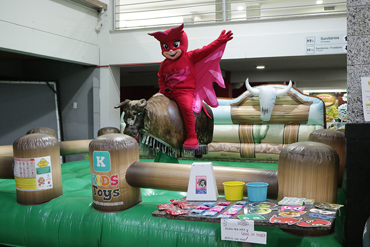 O espaço funciona todos os dias, de segunda a domingo, das 11 horas às 20h30. Os ingressos podem ser comprados no local ao valor de R$ 5,00 para cinco minutos de diversão. O proprietário da Kids Toys, Lucas Maidana, explica que também é possível adquirir combos de meia hora por R$ 20,00 e de uma hora por R$ 30,00. “Quem optar por um dos combos leva um brinde, que pode ser uma máscara de personagem ou um algodão doce”, explica. A diversão ainda é um convite para a solidariedade: no local, está disponível uma urna de contribuição para a Campanha Ame Juju.