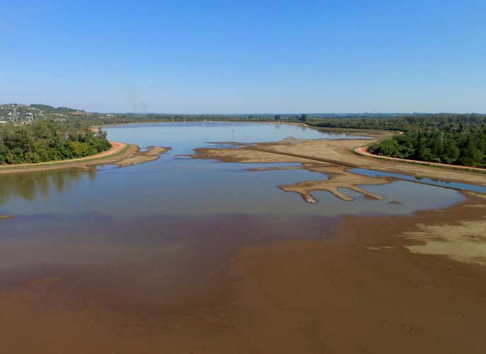Um dos maiores reservatórios artificiais do Rio Grande do Sul, o Lago Dourado está com menos da metade da capacidade de armazenagem de água, responsável pelo abastecimento de 95% da população de Santa Cruz do Sul. Com o nível do Rio Pardinho abaixo do normal e fornecimento intermitente desde dezembro, o reservatório opera com apenas 40% de sua capacidade normal. Com bancos de areia e assoreamentos perceptíveis em diversos pontos, a projeção de abastecimento ainda é para 40 dias se não chover. Diante desse cenário, a Corsan colocou em prática diversas ações emergenciais para garantir o abastecimento até a chegada das chuvas. Como se não bastasse a seca, as temperaturas mais altas registradas nos últimos dias provocam, além do aumento no consumo, a evaporação da água.