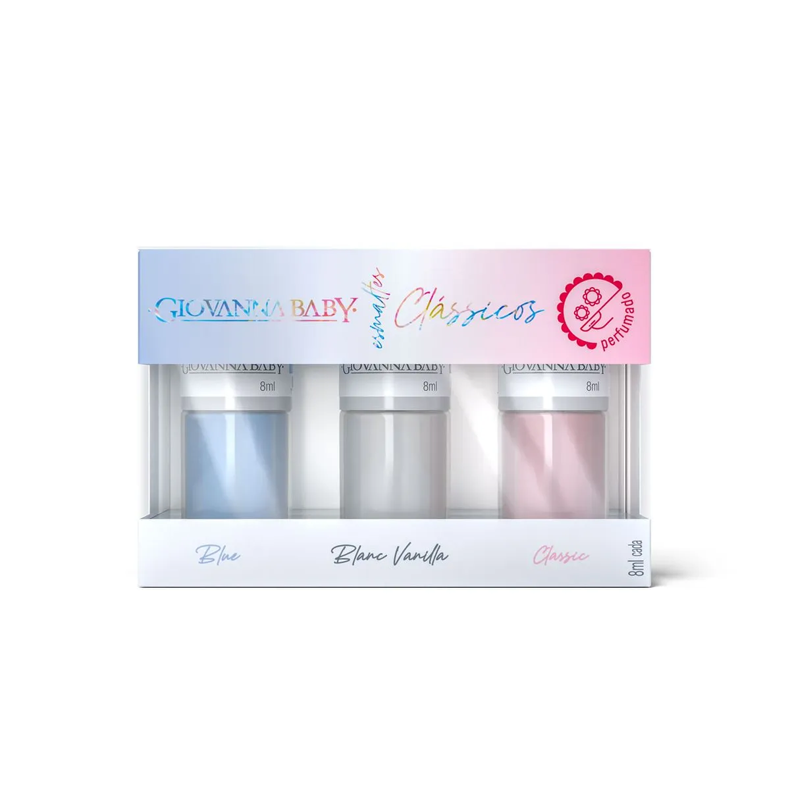 As cores padrão de Giovanna Baby, como o rosa e o azul pastel, além do branco, compõem a categoria Clássicos. As consagradas fragrâncias estão nos esmaltes.