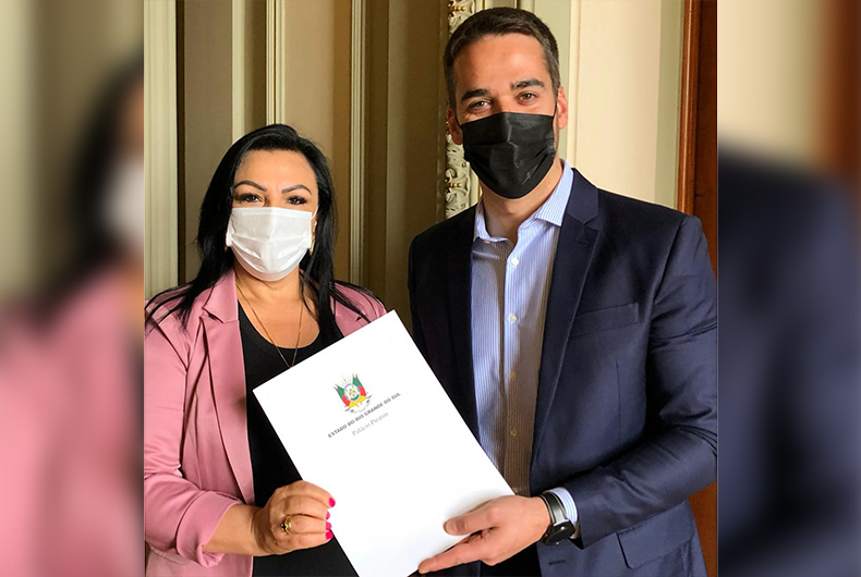 Antes da reunião com os parlamentares da base aliada em que foi apresentada a proposta de reajuste para os professores da rede estadual na manhã dessa quarta-feira, 8, no Palácio Piratini, a deputada estadual santa-cruzense Kelly Moraes (PTB) recebeu das mãos do governador Eduardo Leite (PSDB) a lei 15.271/2021, de sua autoria e já sancionada. Ela reserva 5% das vagas de emprego nas empresas prestadoras de serviços terceirizados de mão de obra, contratadas pelo Estado, para mulheres vítimas de violência doméstica e familiar que estejam sob medida protetiva.