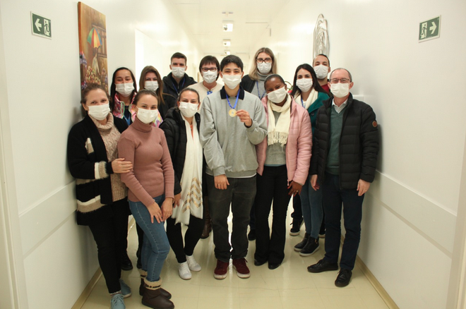 O diretor geral do Hospital Santa Cruz, Vilmar Thomé, entregou uma medalha simbólica para Letícia como reconhecimento por sua trajetória no esporte representando Santa Cruz do Sul. Em seguida, a atleta também recebeu uma homenagem dos colegas de trabalho.