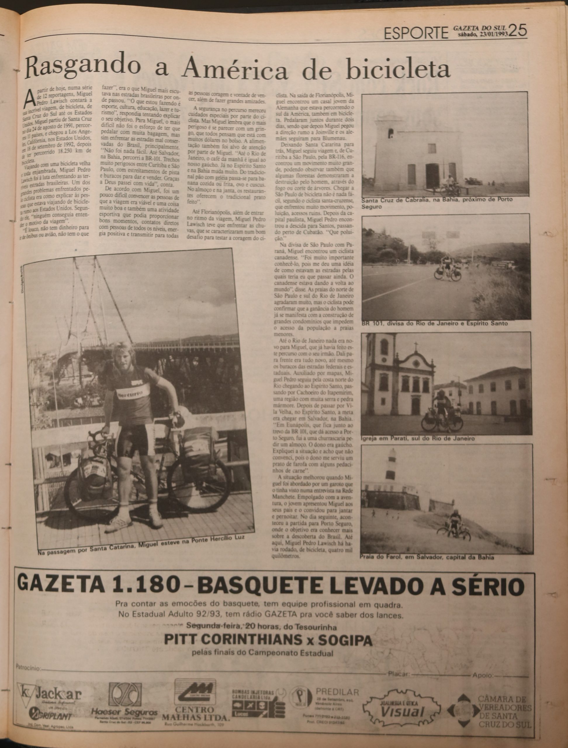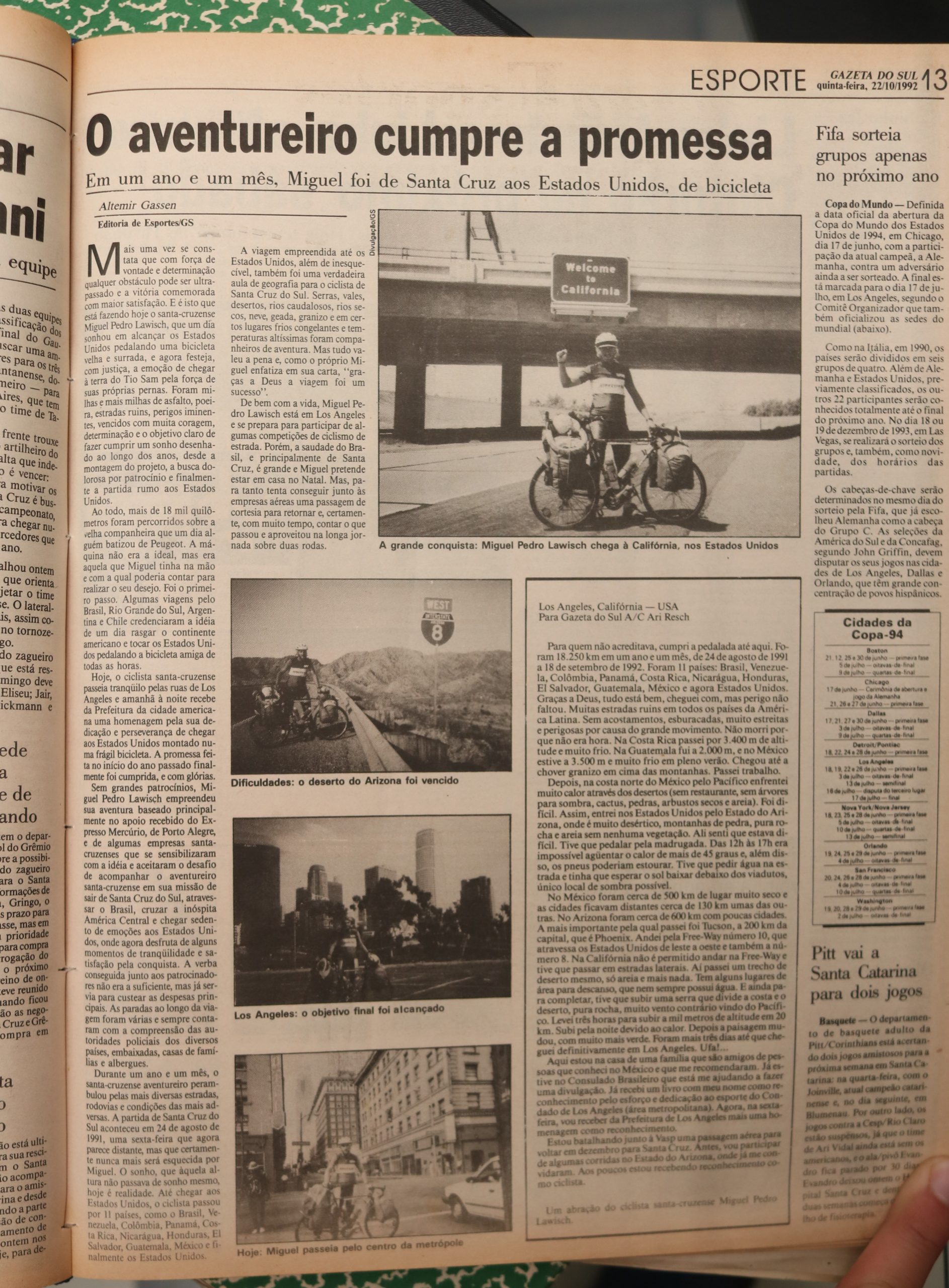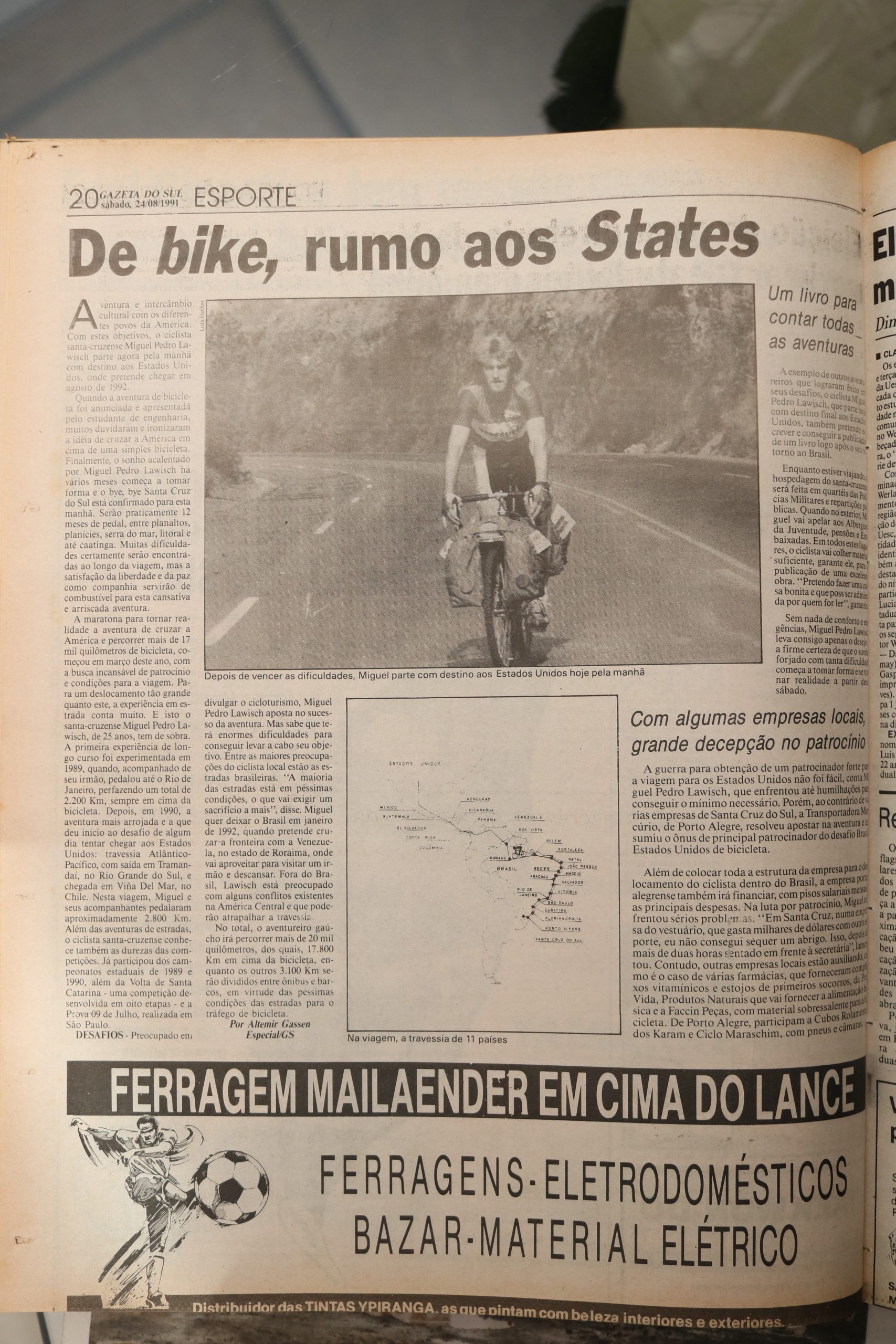 Quando partiu de Santa Cruz do Sul em direção aos Estados Unidos em cima de uma bicicleta, em 1992, Miguel Pedro Lawisch tinha muita coragem e poucas certezas. Depois de pouco mais de um ano e cerca de 18 mil quilômetros pedalados, ele chegou ao seu destino e retornou ao Brasil em segurança. Agora, 30 anos após o fim da aventura, as histórias serão contadas em um livro, escrito pelo jornalista, escritor, professor e também cicloturista Demétrio de Azeredo Soster. O lançamento está previsto para o dia 15 de dezembro deste ano.