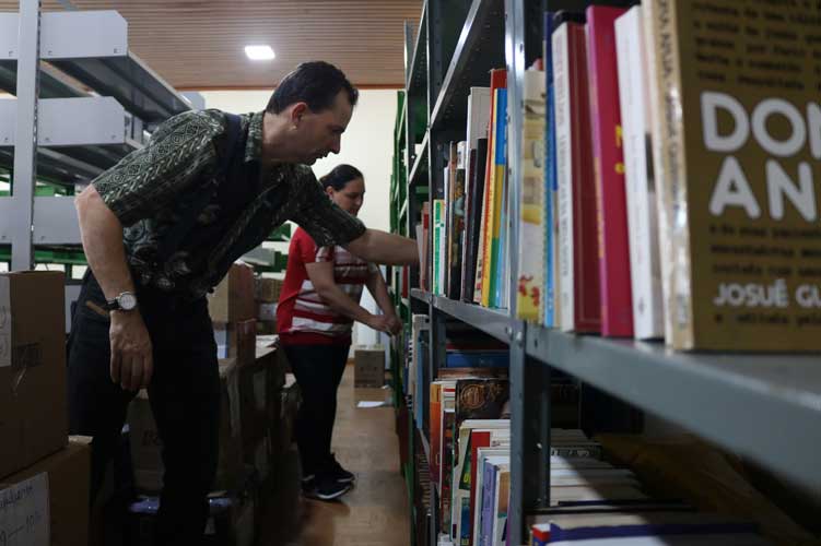 Hora de organizar: Jair Teves e a funcionária Gabriela Jacques passaram a quinta-feira arrumando as obras nas estantes, trabalho que deve se estender pelos próximos dias