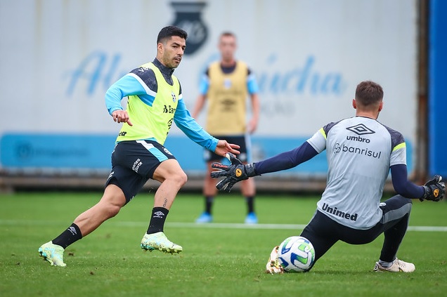 No trabalho com bola, o técnico Renato Portaluppi dividiu o elenco em dois times com nove jogadores para atuarem em campo reduzido. Do lado de fora, três esperavam no ataque para finalizar contra os goleiros: Suárez, Vina e Jhonata Robert. Na atividade em campo reduzido, Suárez demonstrou dores constantes no joelho direito.