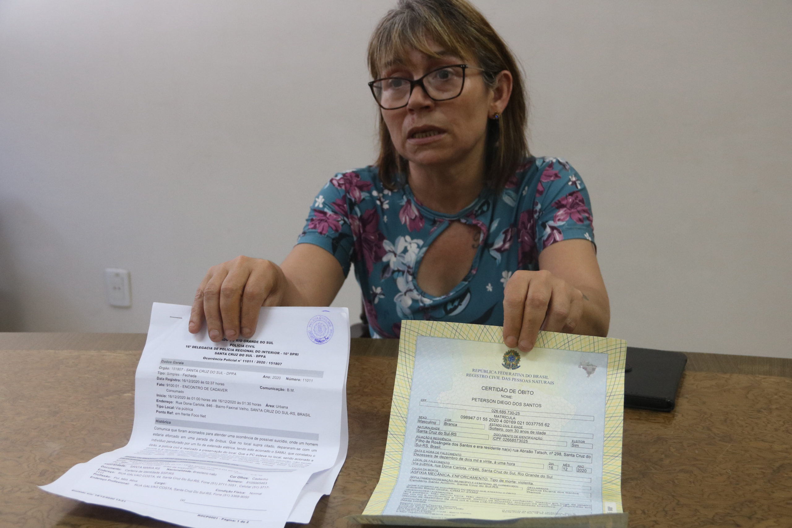 Rosângela, a mãe, mostra o atestado de óbito e o registro policial a respeito do fato