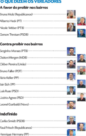 Outros oito vereadores, além de Serginho, disseram-se contrários à vedação. Segundo Daiton Margen (MDB), trata-se de uma “necessidade de sobrevivência”, enquanto Jair Eich (PP) alegou que não há motivo para impedir a circulação de animais nos bairros, desde que sejam “devidamente alimentados e cuidados”. Luís Ruas (PSD) afirmou que as atividades que envolvem o uso desses veículos são “dignas e mantêm várias famílias”. Já Licério Agnes (PSD) alegou que não se pode penalizar as pessoas que cuidam bem de seus animais. “Não podemos generalizar alguns casos isolados e querer colocar a nossa cultura em votação”, argumentou. Cleber Pereira (União) e Ilário Keller (PP) também se disseram contra a proibição.