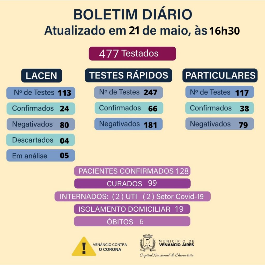 Venâncio Aires tem agora 128 confirmações. Dois novos casos foram registrados nesta quinta-feira, 21. Dos 128 infectados no município, 99 estão recuperados. Há quatro moradores de Venâncio com confirmação da doença internados no Hospital São Sebastião Mártir (HSSM) e 19 pessoas se recuperam em isolamento domiciliar. O HSSM tem ainda dez pacientes com suspeita da doença, quatro na UTI e seis no setor Covid-19.