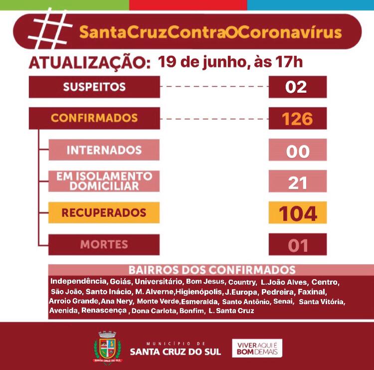 O boletim mais recente da Prefeitura, com dados até as 17 horas desta sexta-feira, 19, trouxe cinco novos casos de Covid-19 entre moradores de Santa Cruz do Sul, elevando o total para 126. Destes, 21 são casos ativos, de pacientes ainda em recuperação. Nenhum deles está internado e todos cumprem isolamento domiciliar.