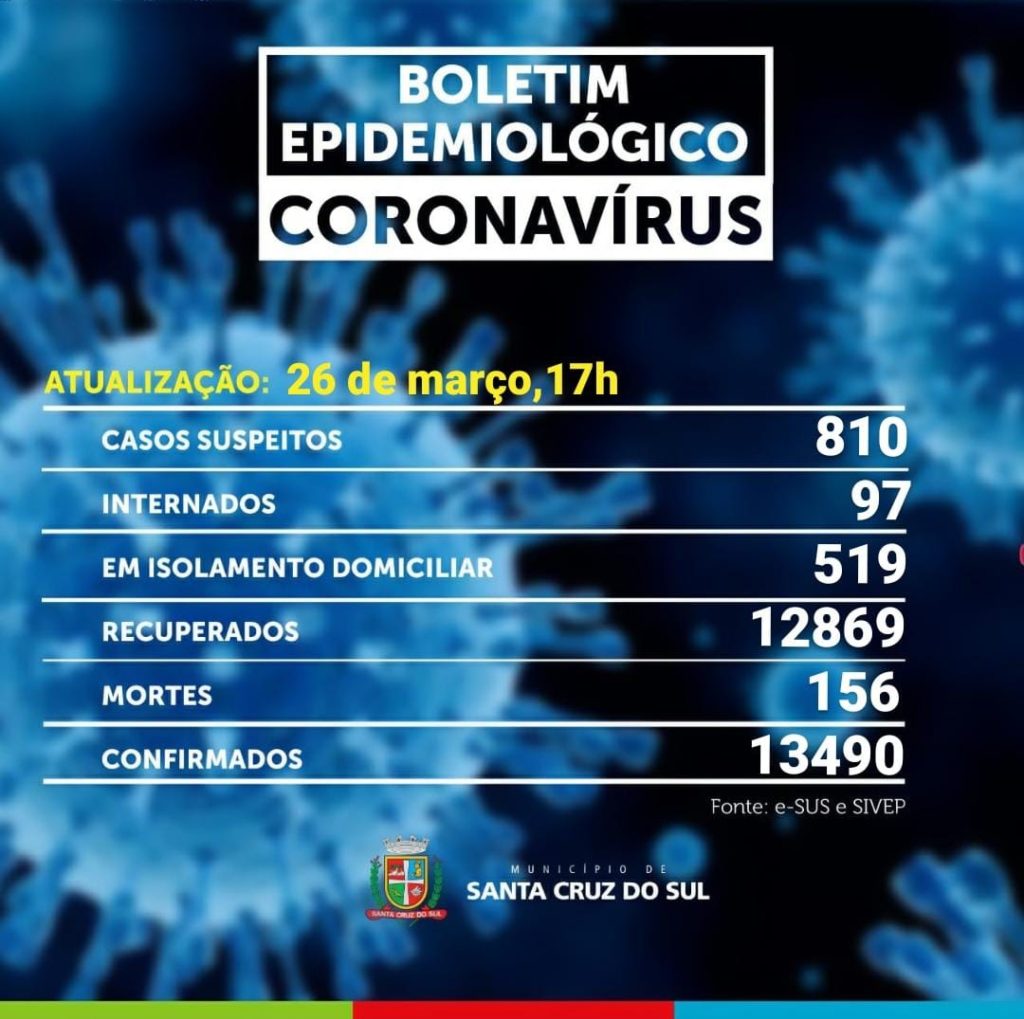Desde o início da pandemia, Santa Cruz já registrou 13.490 casos confirmados de infecção pelo coronavírus e destes, 12.869 são considerados recuperados. A Secretaria ainda acompanha 810 pessoas com suspeita da doença e que aguardam resultados de exames.