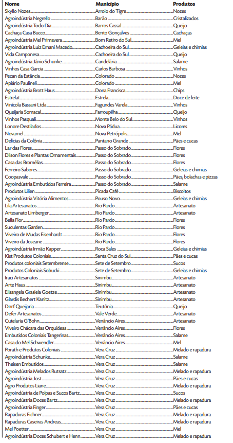 A região terá 39 empreendimentos familiares na feira para venda de produtos. O maior número é procedente de Vera Cruz, com 13, de variados tipos de alimentos. Em seguida vêm os municípios de Passo do Sobrado e Rio Pardo, ambos com seis representantes, predominando o setor das flores. Sinimbu e Venâncio Aires terão quatro cada, enquanto Arroio do Tigre, Barros Cassal, Candelária, Pantano Grande, Santa Cruz e Vale Verde terão apenas um cada.