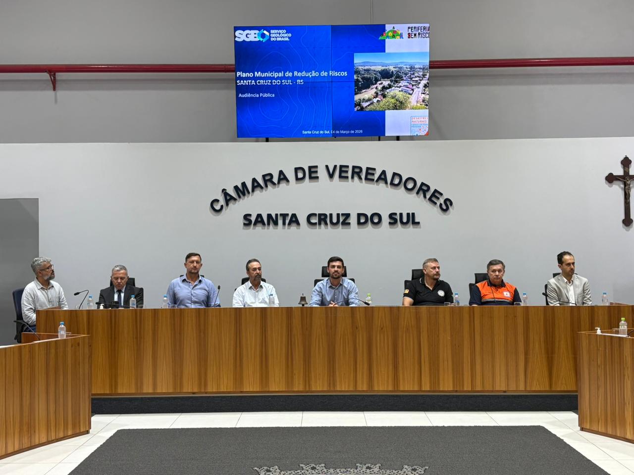 O Serviço Geológico do Brasil (SGB) e a Secretaria Nacional de Periferias do Ministério das Cidades apresentaram, nesta quarta-feira, 4, o Plano Municipal de Redução de Riscos (PMRR) do município de Santa Cruz do Sul. Em audiência pública na Câmara de Vereadores, pela manhã, foram divulgados os resultados do mapeamento de áreas de risco geológico e hidrológico, além de apresentadas as propostas de intervenções para reduzir ou mitigar os riscos existentes.