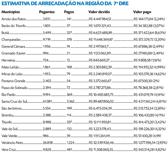 O delegado da 7ª DRE, Luiz Augusto Wickert, diz que ainda é cedo para uma avaliação precisa. Um balanço mais detalhado será feito após o dia 30, quando se encerra o período de antecipação. “Nos últimos anos, 40% do valor esperado foi recolhido de forma antecipada em Santa Cruz”, afirmou.