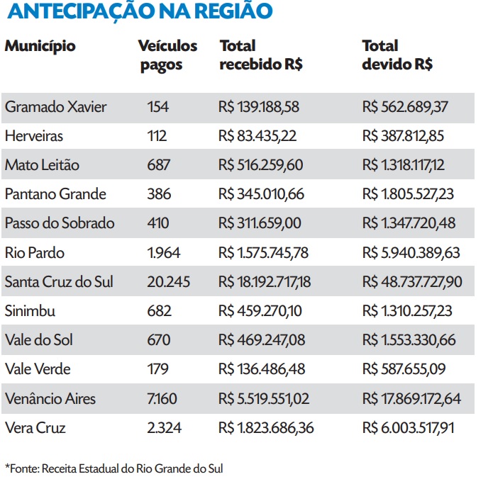 O percentual de recebimento mais alto é o de Santa Cruz do Sul (37,33% do todo). Pantano Grande é o município com o menor índice de pagamento antecipado – apenas 19,11% do valor foi quitado ainda em 2020.