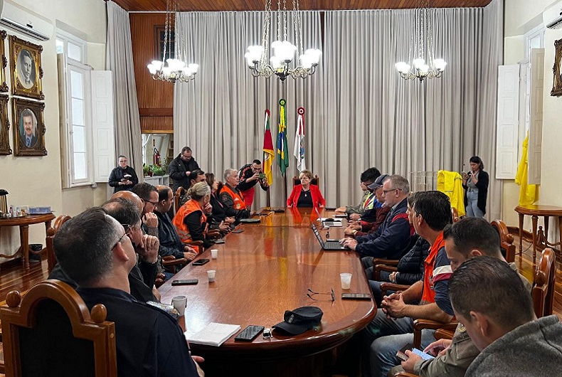 “Resgatar as pessoas que precisam de socorro continua sendo nossa prioridade”, disse a prefeita Helena Hermany, em sua fala inicial durante a reunião do Gabinete de Crise, realizada na manhã desta quarta-feira, 1º de maio, no Salão Nobre do Palacinho. O encontro contou com representantes de todas as secretarias do município, Defesa Civil, e gestores de órgãos como a Brigada Militar, Corpo de Bombeiros, 7º Batalhão de Infantaria Blindado (7º BIB), RGE e Aegea/Corsan. Entre as definições, foi confirmada a vinda de mais dois helicópteros para resgates.