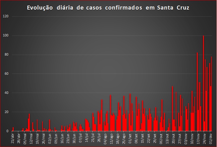 Santa Cruz ampliou novamente o recorde de confirmação de casos de Covid-19 em 24 horas. Foram 78 novos registros entre as 17 horas dessa terça e as 17 horas desta quarta-feira, 2. O recorde anterior era de 75 casos, há exatamente uma semana, no dia 25 de novembro.