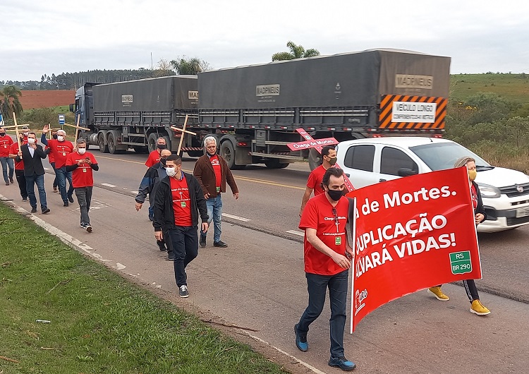 Com faixas e cruzes com as frases Chega de mortes. A duplicação Salvará Vidas!, o ato não causou o bloqueio do trânsito. De acordo com o prefeito de General Câmara e presidente da Asmurc, Helton Barreto, desde 2014 a região acompanha o descaso com a duplicação da rodovia, em que diversas vezes os canteiros de obras foram abandonados. Um fato curioso aconteceu em frente ao trevo de acesso ao município de Arroio dos Ratos, onde a caminhada pela rodovia foi encerrada com discursos dos prefeitos participantes. Enquanto o prefeito Carlos Gustavo Schuch discursava sobre os perigos do trajeto, um acidente ocorreu a poucos metros dos manifestantes, entre uma motocicleta e um veículo.