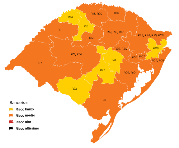Entre as 20 regiões do Estado consideradas no modelo, segue a predominância da bandeira laranja – são 14 conjuntos de municípios com essa classificação, de risco epidemiológico médio. As regiões de Uruguaiana e Capão da Canoa haviam progredido para a bandeira amarela na semana que passou, mas agora retornam à laranja, porque apresentaram piora nos indicadores de risco considerados pelo sistema.