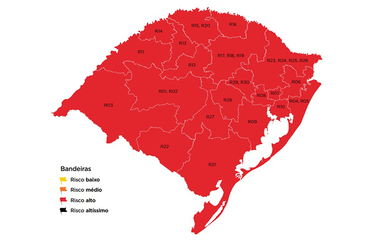 O Rio Grande do Sul passa pelo momento mais crítico da pandemia de coronavírus. Com o número de pacientes internados em leitos clínicos e em UTIs atingindo o pico da série histórica, o mapa preliminar da 30ª semana do Distanciamento Controlado, divulgado nesta sexta-feira, 27, traz, pela primeira vez, todas as 21 regiões Covid em bandeira vermelha (risco epidemiológico alto).
