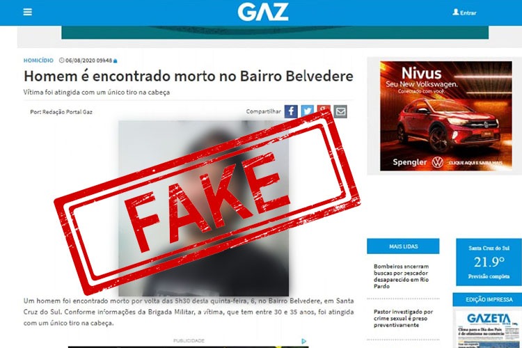Circula nas redes sociais a imagem de uma suposta matéria veiculada pelo Portal Gaz, na manhã desta quinta-feira, 6, que identifica, por meio de uma fotografia, a vítima de um homicídio ocorrido nesta madrugada no Bairro Belvedere, em Santa Cruz do Sul. A imagem, no entanto, é FALSA. Trata-se de uma montagem feita a partir do conteúdo efetivamente publicado, mas com inserção de uma fotografia não publicada pelo Portal Gaz.