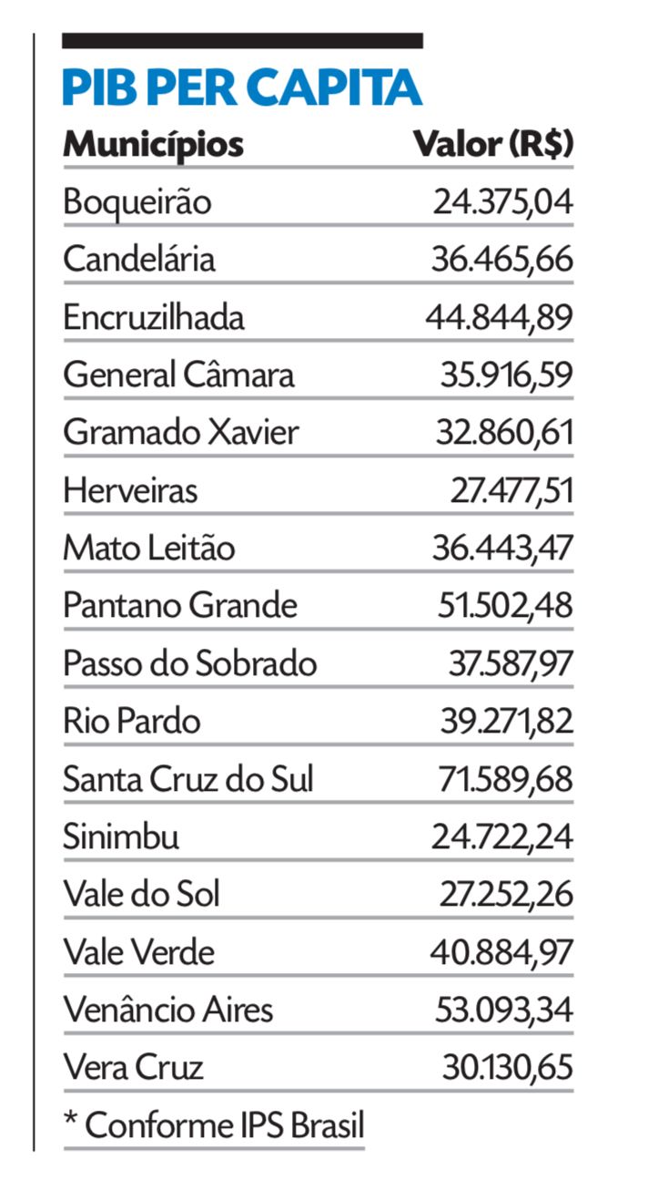 Santa Cruz do Sul, por exemplo, teve apontado PIB per capita de R$ 71.589.68. Tem seus dados comparados com Arroio do Meio, Dois Irmãos e Veranópolis, no Rio Grande do Sul; Fernando de Noronha, no Pernambuco; Rio Verde, em Goiás; e Santana do Parnaíba, em São Paulo. Apareceu com conceito fraco em vacinação contra a poliomielite, domicílios com iluminação adequada e famílias em situação de rua. Porém, supera nos quesitos áreas verdes urbanizadas e acesso à cultura, lazer e esporte e na nota mediana do Exame Nacional do Ensino Médio.