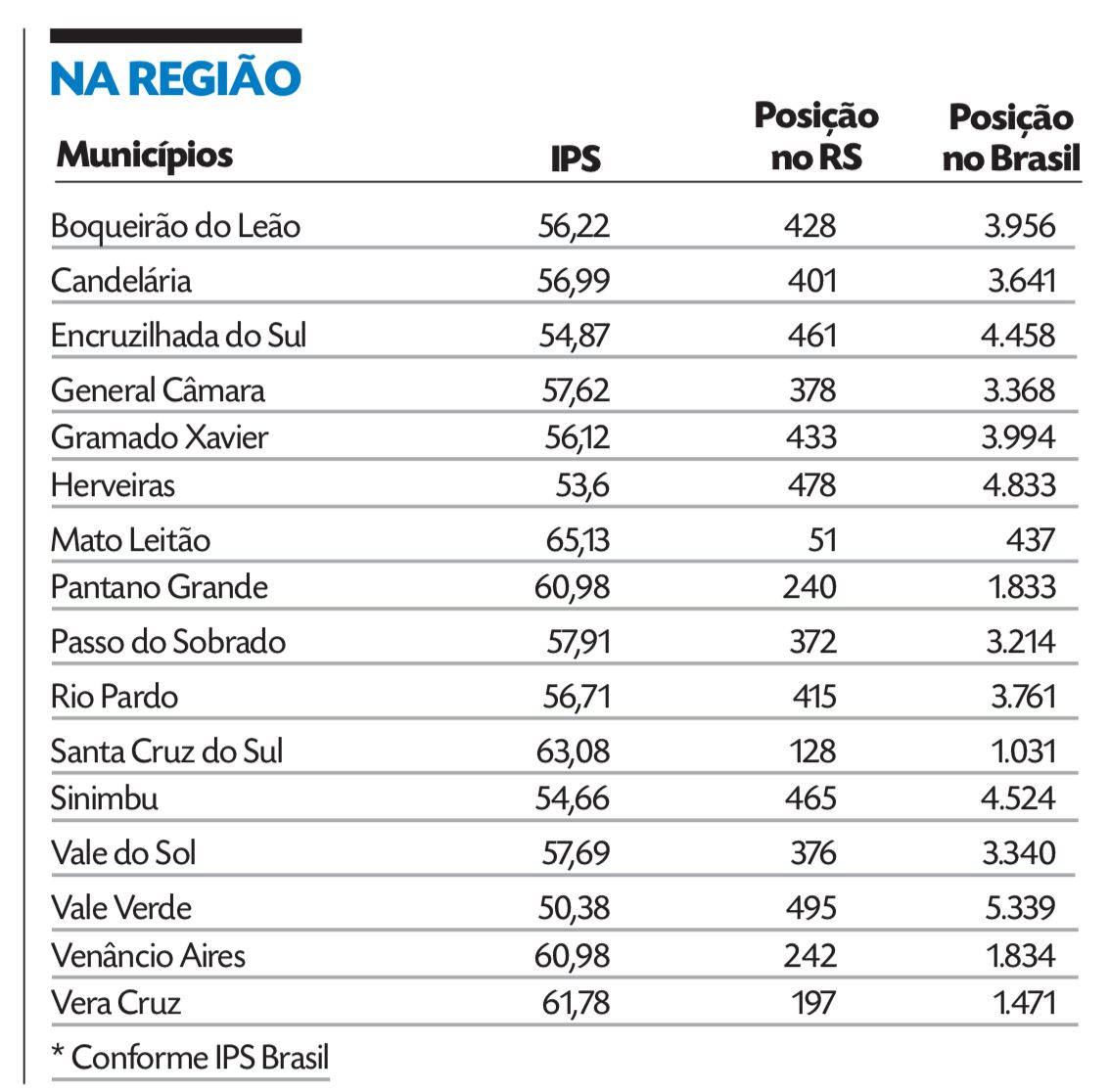 Também ficaram acima de 60 Pantano Grande, Venâncio Aires e Vera Cruz. A menor nota foi a de Vale Verde, que somou 50,38, ocupando o antepenúltimo posto entre os municípios gaúchos e no grupo dos 250 piores do País.