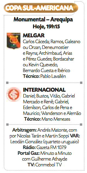 Do outro lado, o técnico Pablo Lavallén também aposta no fator casa para abrir vantagem diante do Internacional. Ele não deve fazer grandes mudanças no time titular do Melgar em relação à equipe que vem atuando na Sul-Americana. Ele tem apenas duas dúvidas: na defesa, Galeano e Orzan disputam vaga; e no ataque, entre Bordacahar e Kevin Quevedo.