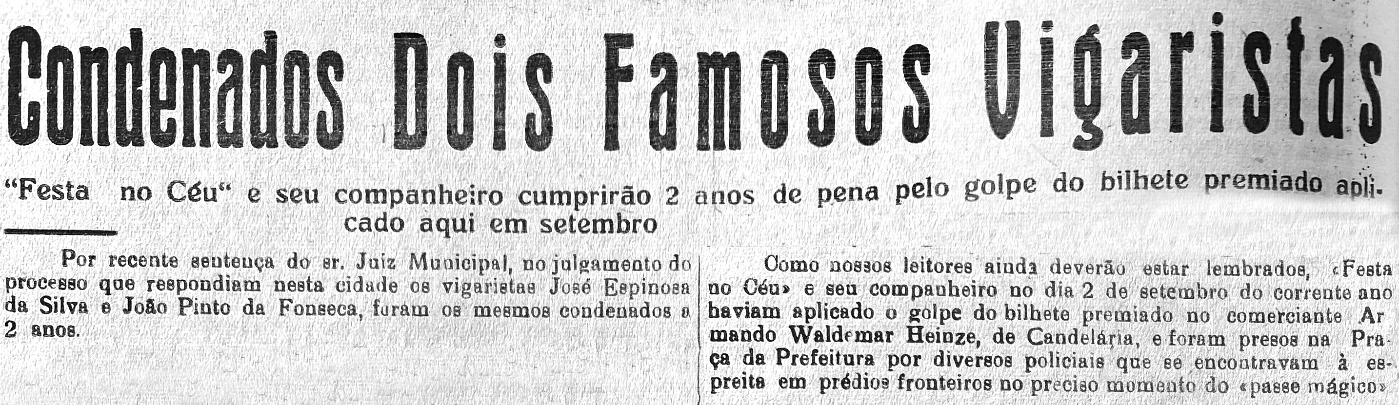 Segundo relata a Gazeta de 9 de setembro, quando os dois vigaristas foram presos na Praça da Bandeira, disseram chamar-se José Carlos Gomes e João Pinto da Fonseca. Os policiais, no entanto, descobriram que Gomes, na verdade, era José Espinosa da Silva, vulgo “Festa no Céu”. Ele e o comparsa eram golpistas conhecidos em Porto Alegre. Espinosa, recentemente, havia sido preso em Bagé.