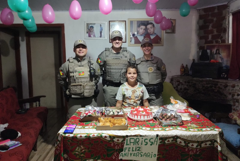 A pequena Larissa Moraes, moradora do Bairro Baixada, em Sobradinho, realizou um sonho na tarde dessa segunda-feira, 22. Enquanto comemorava seu aniversário de 8 anos junto à família, ela recebeu a visita de policiais da Brigada Militar (BM) de Sobradinho.