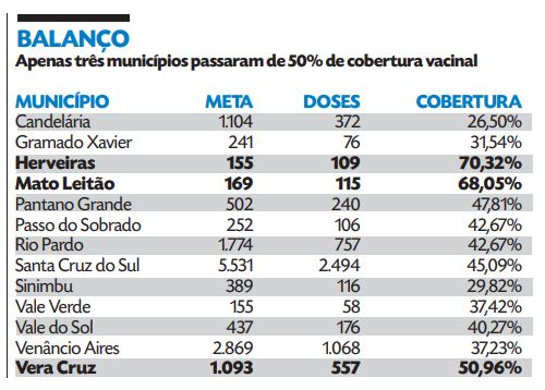 Segundo uma das responsáveis pelo setor de imunizações da 13ª Coordenadoria Regional de Saúde (13ª CRS), Jaqueline Thier Müller, embora tenha havido melhora nos números com a mobilização no último sábado, o número de crianças vacinadas ainda está muito aquém do esperado. “O que mais nos preocupa é que apenas três municípios atingiram a meta de 50% de cobertura vacinal, e temos somente mais duas semanas de campanha. Não conseguimos atingir nem mesmo a metade da meta da 13ª CRS, que é de 95%”, comentou.
