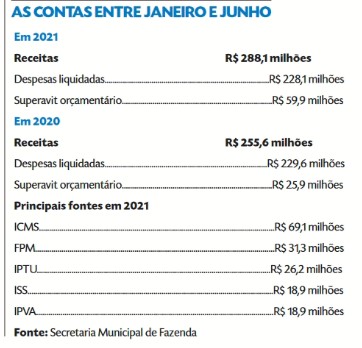 A arrecadação do semestre superou em mais de R$ 15,9 milhões o valor projetado no orçamentário de 2021. Somente via Imposto Sobre Circulação de Mercadorias e Serviços (ICMS), foram injetados mais de R$ 69 milhões nos cofres da Prefeitura. Foi a principal fonte de recursos do Município no período, seguido pelo Fundo de Participação dos Municípios (FPM) e pelo Imposto Predial e Territorial Urbano (IPTU) – ainda que o prazo para quitação da primeira parcela, que seria em abril, tenha sido postergado para dezembro.