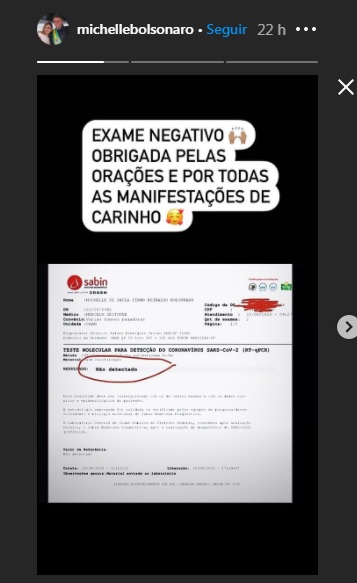 A primeira-dama, Michelle Bolsonaro, usou as redes sociais para divulgar o resultado negativo de seu exame para o novo coronavírus. Em 30 de julho, a esposa do presidente Jair Bolsonaro anunciou ter testado positivo para o vírus. Em suas redes sociais, Michelle publicou nesse sábado, 15, seu teste com o resultado “não detectado” para o vírus.