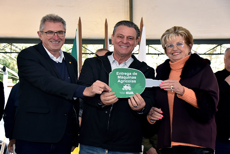 Deputado federal Heitor Schuch e a prefeita Helena Hermany receberam as chaves das novas máquinas do ministro Carlos Fávaro