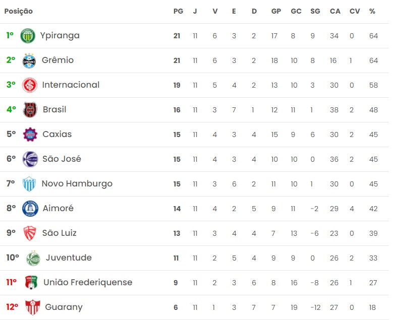 O Guarany já estava rebaixado, e terminou na lanterna do campeonato, com seis pontos, na 12ª posição. Com o empate, o Inter chegou à 19 pontos, na terceira posição, e pega o Grêmio na semifinal. O União Frederiquense, que neste sábado, 12, foi derrotado pelo Caxias por 3 a 0, é o segundo rebaixado, ficando na 11ª posição, com 9 pontos.