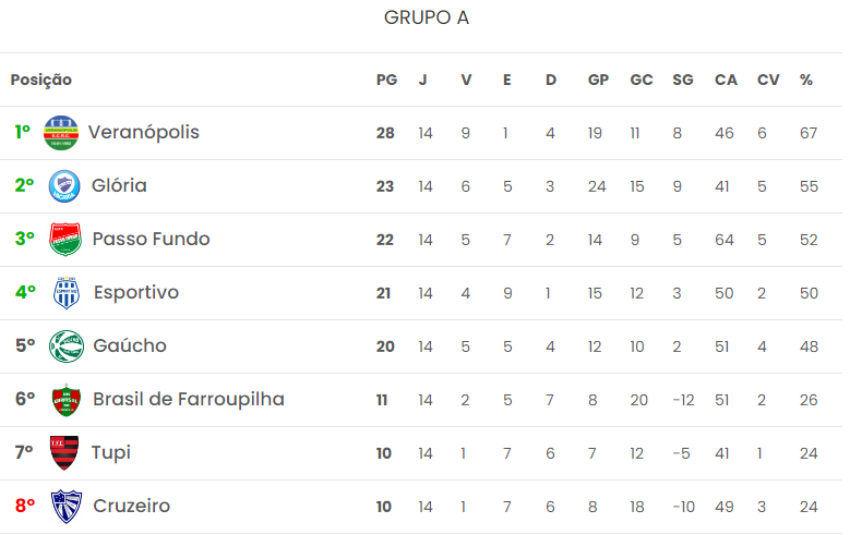 No Grupo A, o Veranópolis ficou em primeiro, com 28 pontos. O Glória ficou em segundo, com 23, seguido por Passo Fundo, 22, e Esportivo, 21 pontos.