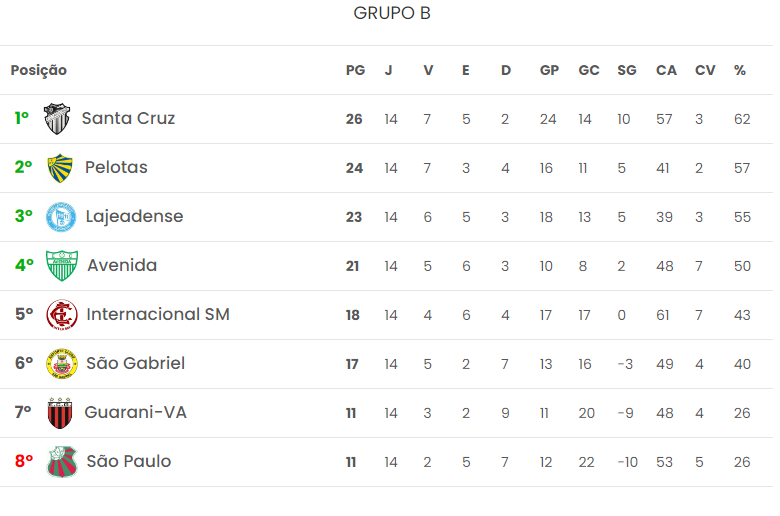Com a vitória, o Santa Cruz alcançou 26 pontos, e ultrapassou o Pelotas, voltando à liderança do Grupo. O Lobão perdeu o clássico da Zona Sul contra o São Paulo-RG, pelo placar de 1 a 0, e terminou a primeira fase em segundo. Lajeadense, em terceiro, com 23 pontos, e Avenida, com 21 pontos, completam o G-4 do Grupo B.