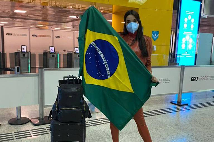 As atividades com as candidatas terão início em 6 de maio e no dia 16 deve ocorrer a cerimônia de premiação. A modelo e atriz fez uma postagem do embarque no Instagram, segurando uma bandeira do Brasil (foto).