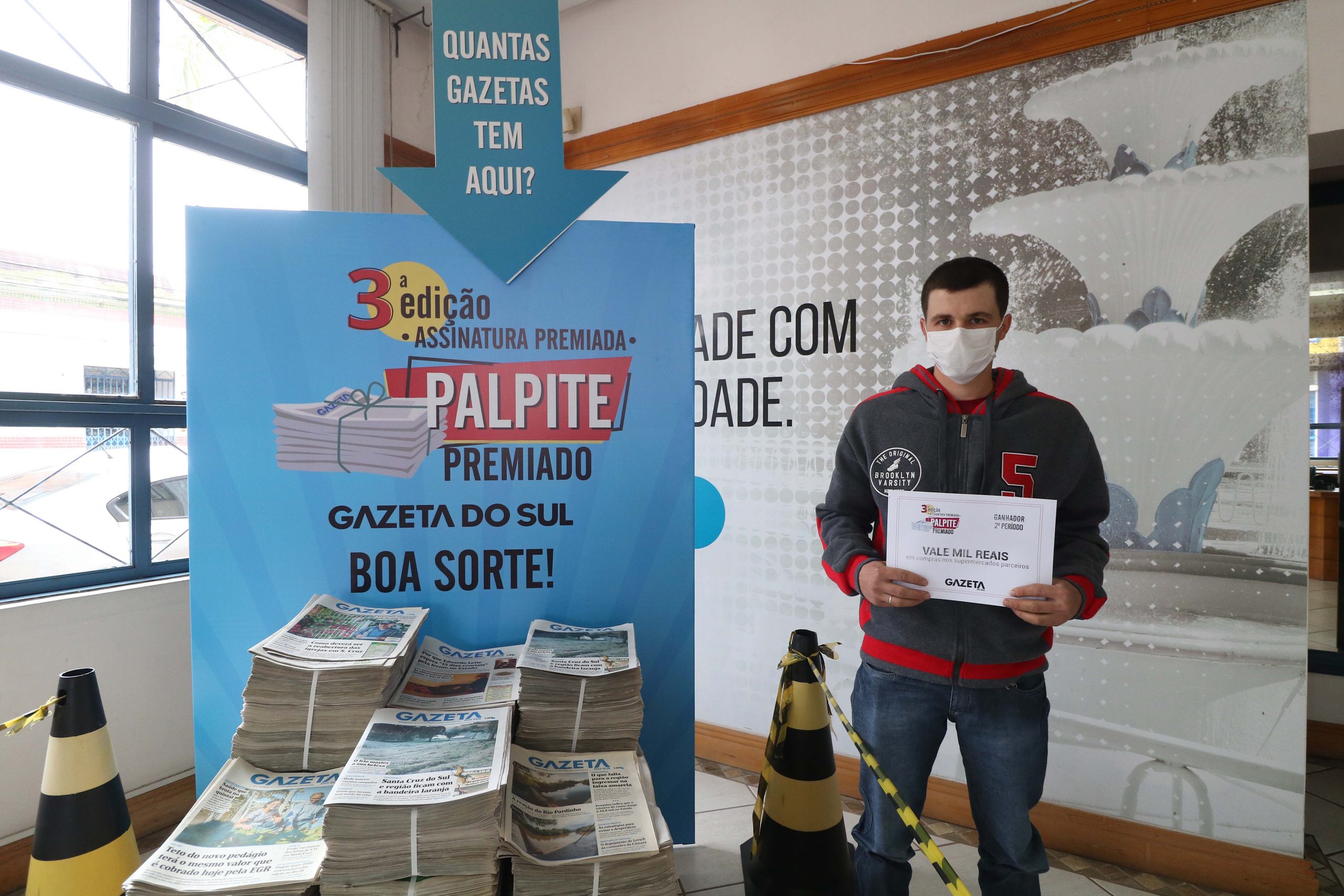 A terceira edição do concurso cultural Palpite Premiado, do jornal Gazeta do Sul, contemplou em julho um morador de Linha Primavera, interior de Sinimbu. O agricultor Felipe Luís Dorfey retirou nessa quarta-feira, 8, na Casa de Clientes o vale-compras de R$ 1 mil, que poderá ser trocado no Miller Supermercados.