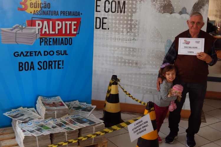 O aposentado Roque Backes, acompanhado da neta Laura, de quatro anos, levou para casa um vale-compras do supermercado Miller, no valor de R$ 1.000,00. Ele foi o primeiro vencedor da terceira edição do Palpite Premiado, concurso cultural que premia assinantes que renovam ou fazem novas assinaturas do jornal Gazeta do Sul. A entrega ocorreu na tarde desta sexta-feira, 26.