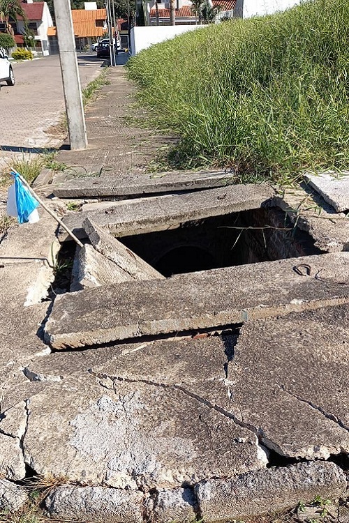 Um buraco em calçada preocupa moradores de Santa Cruz do Sul, na esquina das ruas Susana Kipper e Pastor Laechler, no Bairro Santo Inácio. A situação teria sido causada por uma das enxurradas do começo deste ano, entre janeiro e fevereiro. Desde então, não foi feito conserto do problema, o que causa preocupação não só em quem mora nas proximidades, mas também nos santa-cruzenses que passam pelo local.