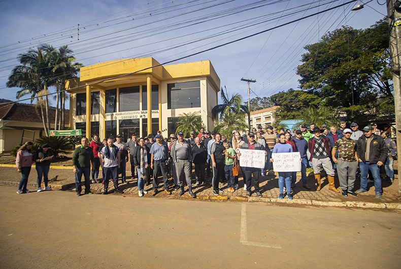 Moradores e produtores rurais do interior de Sinimbu se reuniram em frente à Prefeitura na tarde de sexta-feira, 31, para pedir mais agilidade do poder público na resolução dos problemas provocados pelas chuvas de maio. Algumas localidades estão sem acesso para veículos e sem energia elétrica há um mês e sem previsão de quando o fornecimento será restabelecido. A prefeita Sandra Backes tentou conversar com os manifestantes por alguns minutos, mas os ânimos exaltados fizeram a gestora retornar ao gabinete.