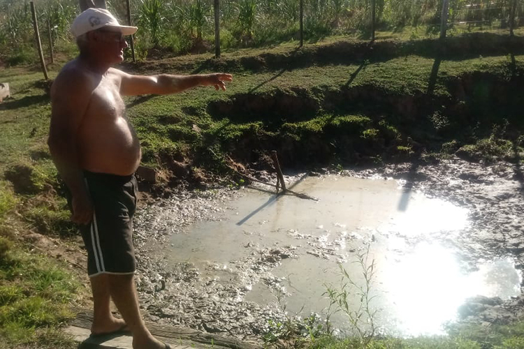 Jaci Padilha, de Vila Botucaraí, mostra a situação do único açude da propriedade: família está transportando água em carroças