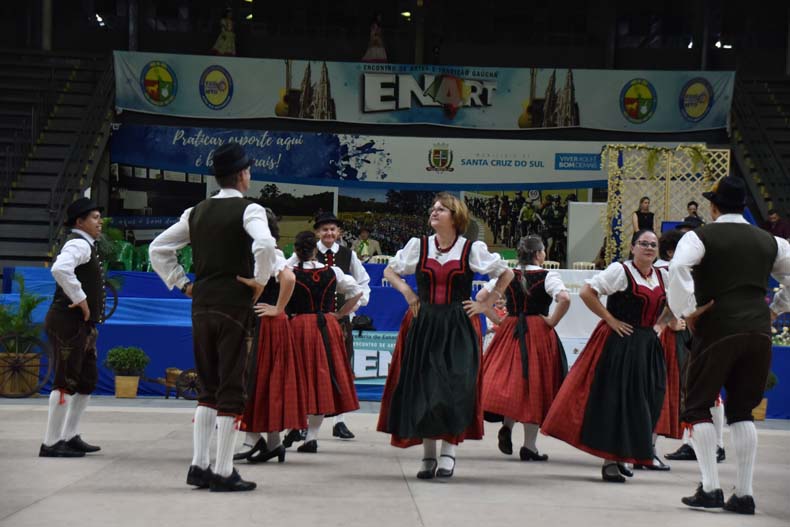 Os grupos de danças germânicas também fizeram bonito e encantaram a plateia. “Nos outros anos, o Enart ficava restrito aos CTGs e entidades tradicionalistas. Agora, com as comemorações dos 200 anos da imigração alemã, fomos convidados e para nós é uma alegria muito grande”, afirmou o presidente do Oktobertanz, Lucas Loebens.